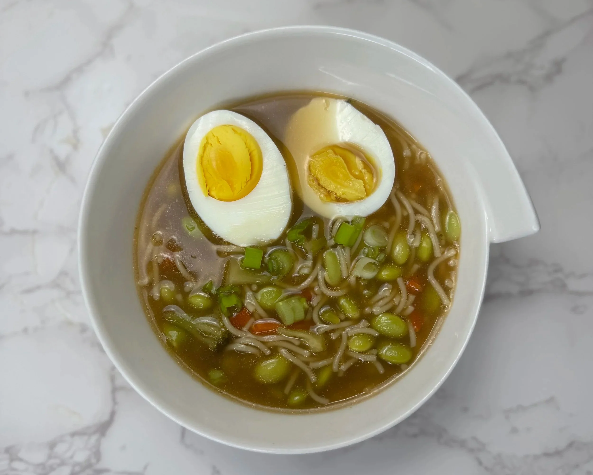 Divide noodles evenly among bowls. Ladle the hot broth, vegetables, and edamame over the noodles.